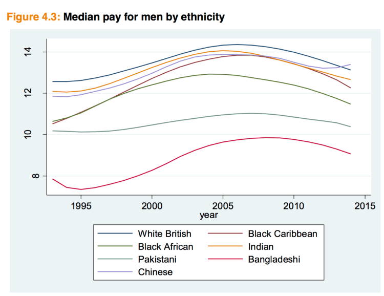 - According to analysis of Labour Force Survey (LFS) data in the period 2002- 2014, the mean hourly pay of different ethnic groups varied considerably. Gaps also varied depending on whether people in ethnic minorities were born in the UK or abroad. Among men, the overall picture was fairly clear. The White British group tended to outperform ethnic minorities in terms of pay – but with a few exceptions. All Indian and Chinese men (that is, both foreign-born and British) and British-born Black African men had similar earnings to White British men. However, all other groups earned noticeably less. Pakistani and Bangladeshi males had particularly severe pay gaps, especially those born outside the UK.
