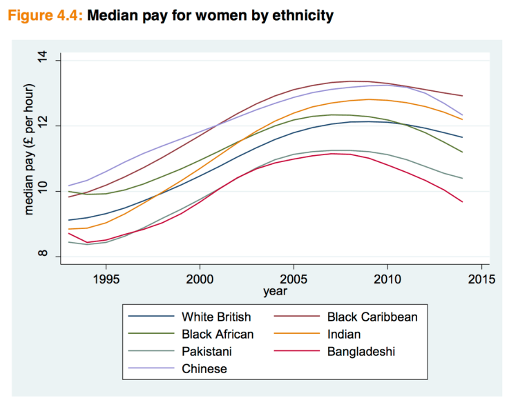 - The pay landscape for women in the same period was more complex. Ethnic minority women generally earned more than White British women, with all Indian, all Chinese, British-born Black Caribbean and British-born Black African women experiencing notable pay advantages. Only two groups had a clear pay disadvantage: these were Pakistani and Bangladeshi immigrant women. However, British-born Pakistani and Bangladeshi women experienced no such disadvantage. Along with female immigrants in the Black African and Black Caribbean group, their pay was found to be fairly similar to White British women’s.