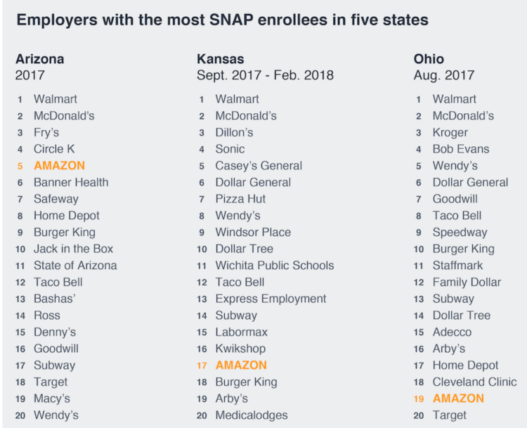 Chosen excerpts by Job Market Monitor. Read the whole story at Amazon gets huge subsidies to provide good jobs—but it’s a top employer of SNAP recipients in at least five states