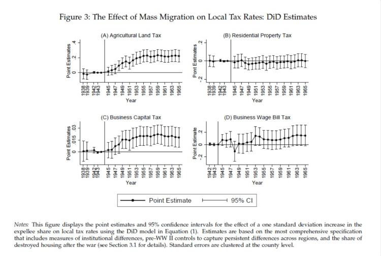 Using panel data for West German cities, the study finds that local governments responded to the migration shock with selective and persistent raises in local taxes as well as shifts in municipal spending. Farm and business owners were taxed more while residential property and wage bill taxes remained largely unchanged (see figure below). High-inflow cities significantly raised welfare spending while reducing spending on infrastructure and housing.