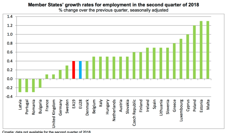 Compared with the same quarter of the previous year, employment increased by 1.5% in the euro area and by 1.4% in the EU28 in the second quarter of 2018 (after +1.5% in both areas in the first quarter of 2018).