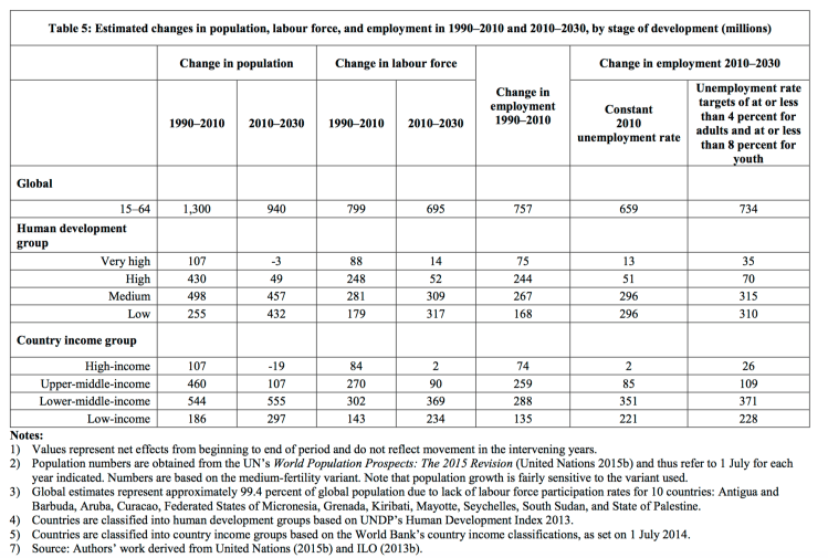 Globally, an estimated 734 million jobs will be required between 2010 and 2030 to accommodate recent and ongoing demographic shifts, account for plausible changes in labour force participation rates, and achieve target unemployment rates of at or below 4 percent for adults and at or below 8 percent for youth.