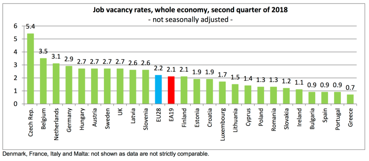 The job vacancy rate in the euro area (EA19) was 2.1% in the second quarter of 2018, stable compared with the previous quarter and up from 1.9% in the second quarter of 2017, according to figures published by Eurostat, the statistical office of the European Union. In the EU28, the job vacancy rate was 2.2% in the second quarter of 2018, stable compared with the previous quarter and up from 2.0% in the second quarter of 2017.