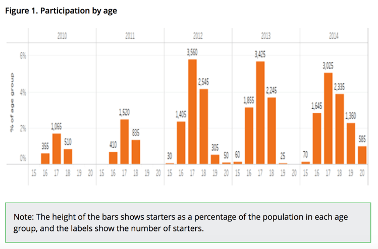 From 2012, 15 year olds with an early leaving exemption were eligible to participate in Youth Guarantee Fees-Free places. From 2014, the age eligibility was further widened to include 18 and 19 year olds.