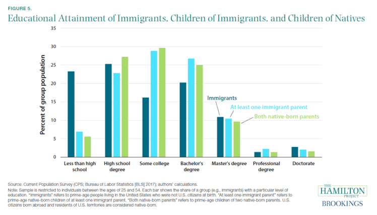 Immigrants are 4 times more likely than children of native-born parents to have less than a high school degree, but are almost twice as likely to have a doctorate.