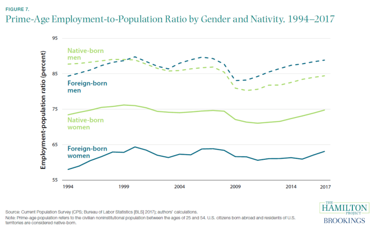 Prime-age foreign-born men work at a higher rate than native-born men, but foreign-born women work at a lower rate than native-born women.