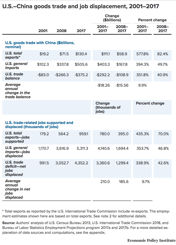 Jobs displaced by the United States’ growing trade deficit with China are a net drain on employment in trade-related industries, especially those in manufacturing. Even if increases in demand in other sectors absorb all the workers displaced by trade (which is unlikely), job quality will likely suffer because many nontraded industries such as retail trade and home health care pay lower wages and have less comprehensive benefits than traded-goods industries (Scott 2013, 2017a).