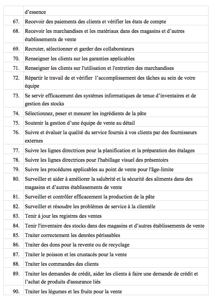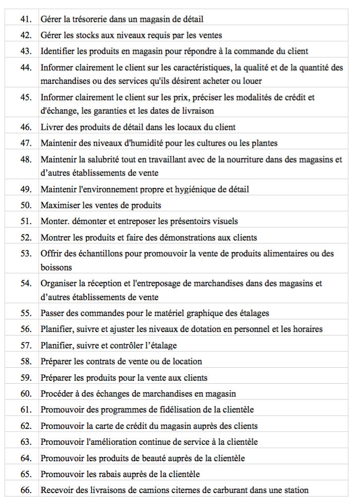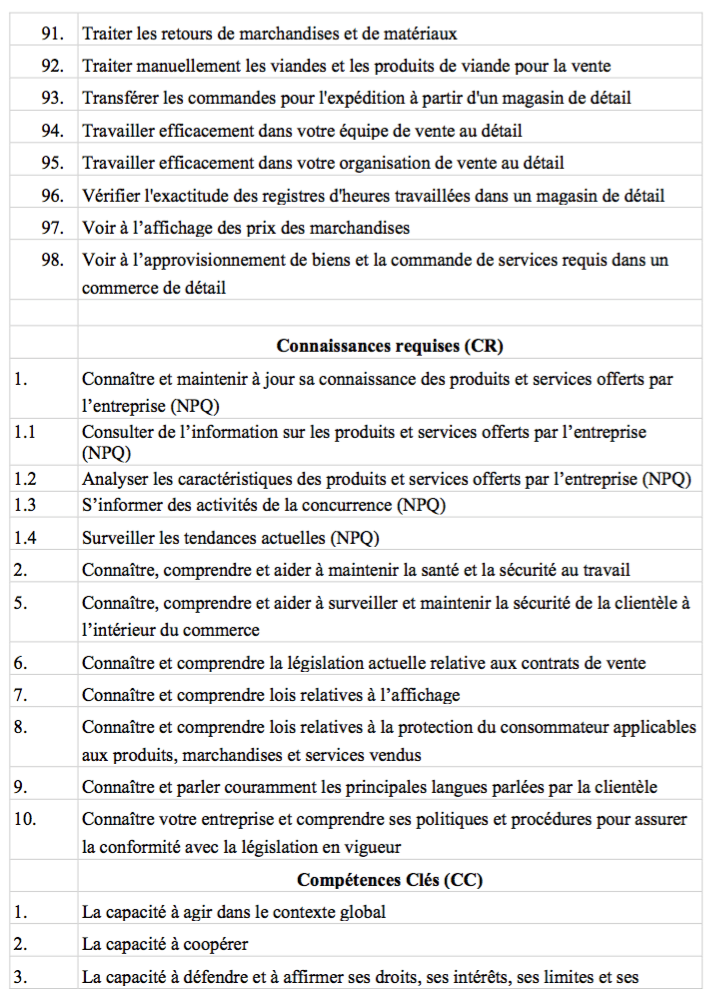 Il s’agit d’une adaptation et de traductions libres le la NOS (National occupationnal standard), UK, Evidence Requirements for the Retail Skills qualifications For use from 1st September 2010, Skillsmart Retail Ltd© augmentée des sources suivantes :