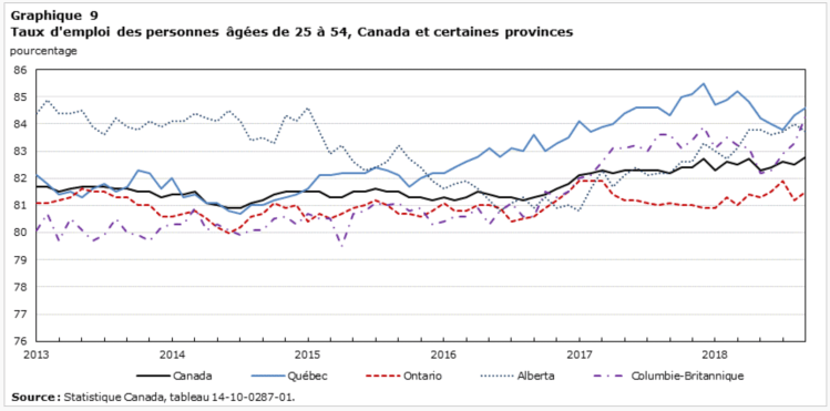 Le taux d’emploi, c’est-à-dire le nombre de personnes occupées en pourcentage de la population en âge de travailler, a diminué légèrement au cours du premier semestre de 2018 pour s’établir à 61,5 % en juin. Parmi les travailleurs du groupe d’âge principal, le taux d’emploi a été relativement stable, se situant en moyenne à 82,5 % au cours de cette période. Le taux d’emploi du groupe d’âge principal en Ontario s’est situé en moyenne à 81,2 % de janvier à juin, comparativement à 83,3 % en Alberta et à 82,9 % en Colombie-Britannique. Au Québec, le taux d’emploi du groupe d’âge principal s’est établi à 84,6 % en moyenne au cours du premier semestre de l’année, soit le taux le plus élevé parmi les provinces, la proportion de personnes occupées de 25 à 54 ans dans la province ayant été plus élevée depuis le milieu de 2014 jusqu’au début de 2018 (graphique 9).