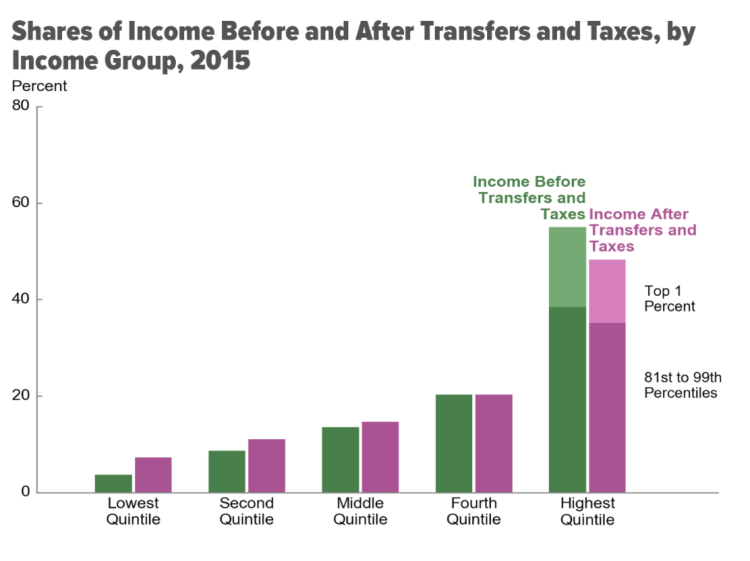 In 2015, average household income before accounting for means-tested transfers and federal taxes was $20,000 for the lowest quintile and $292,000 for the highest quintile. After transfers and taxes, those averages were $33,000 and $215,000.