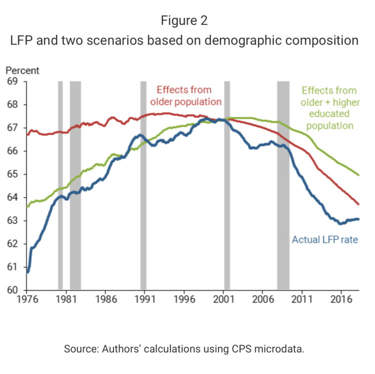 To quantify how much of the decline in the aggregate LFP rate is driven by changes in the composition of the population, we construct two hypothetical aggregate LFP rate scenarios. In this approach, we use Current Population Survey (CPS) microdata from the Bureau for Labor Statistics for 1976–2018 and split the population into 56 age-gender-education groups based on seven age, two gender, and four educational categories. Figure 2 shows the actual (blue line) and our two scenarios for aggregate LFP rates.