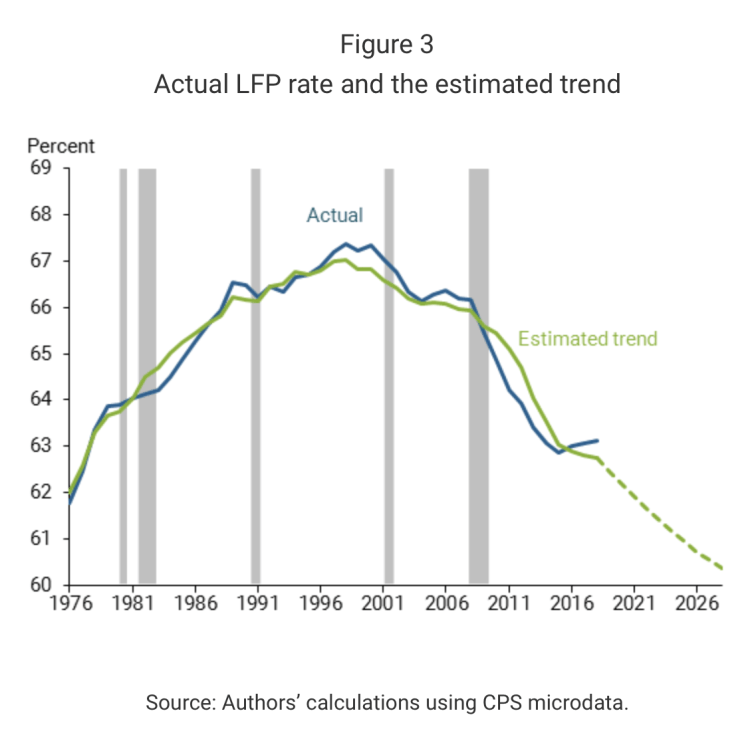 We construct the aggregate LFP rate trend and its projection using our estimates of the trends of different demographic groups and the actual population shares. In the estimation, we use the CBO’s projections of the age composition of the population and fix the educational composition at the latest data point. Figure 3 shows the actual LFP rate and our estimate of its trend.