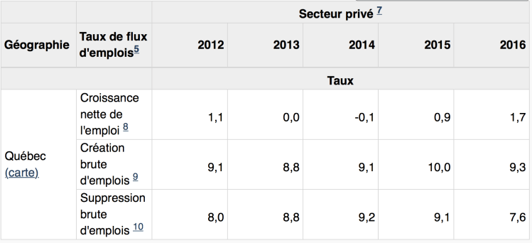 Extraits choisis par le Moniteur de l’emploi . Lire la suite @ Statistique Canada. Tableau 33-10-0089-01 Débits de l’emploi du secteur des entreprises, par secteur, par province ou territoire