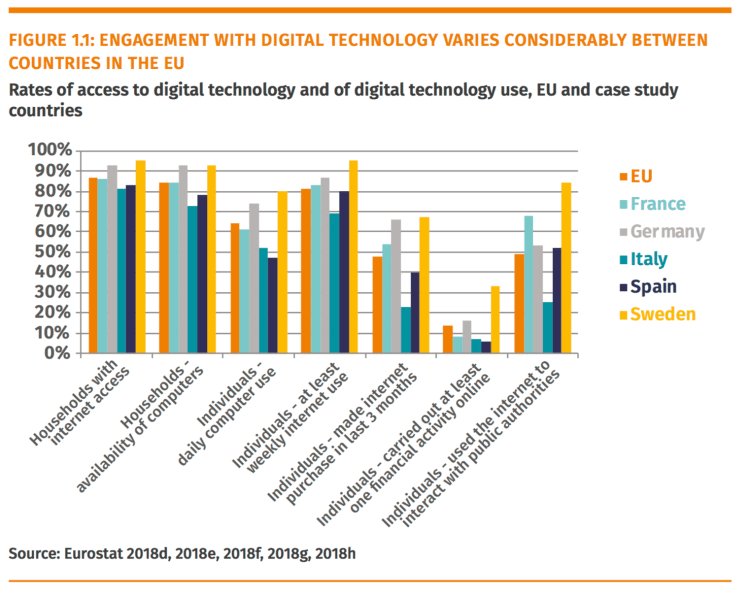Across the EU, levels of digital engagement vary considerably. ‘Frontrunner’ countries have high digital employment as well as commercial and social embedding. Some major economies which rely strongly on traditional industries have moderate levels of engagement, and a growing digital skills base. Countries which have faced economic challenges and high unemployment may be further behind, and there are also contrasts within countries; for example, rural areas, small businesses or marginalised communities may face greater barriers in adopting new technologies. Access to good digital skills development is essential to avoid a ‘digital divide’ between and within nations.