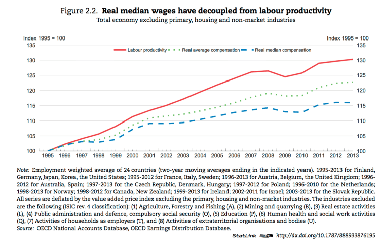 ● In a number of countries, decoupling has gone together with real median wage stagnation. In the United States, for instance, annual real median wage growth over the past two decades has been around 1⁄2 per cent whereas it has been between 1 1⁄2 and 2 per cent in countries with similar productivity growth but no decoupling, such as France, Finland and the United Kingdom.