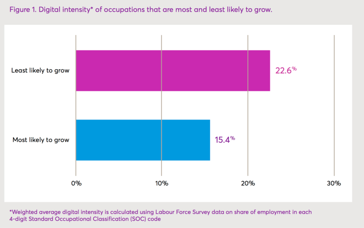 Occupations which we are more certain will have poor prospects are more likely to require a digital skill than the occupations that are most likely to grow by 2030.