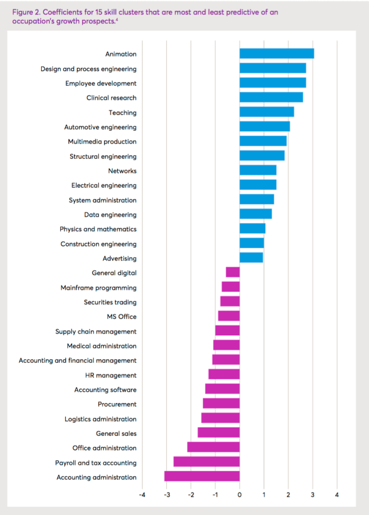 The analysis shows that skills related to using software for administrative purposes (e.g. payroll, accounting, supply chain, sales, etc.) are more prevalent in occupations that are predicted to decline. Examples of these software tools include ADP Payroll, Navision and SAP Warehouse Management.
