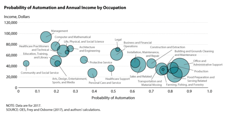 We use estimates from Frey and Osborne (2017) of how likely automation is to affect occupations. They first identify the tasks of each occupation that may become automated: perception and manipulation tasks, creative intelligence tasks, and social intelligence tasks. Then they use a machine learning algorithm to calculate the probabilities of computerization. We merge their estimates with MSA-level occupational employment and wages from the 2017 Occupational Employment Statistics (OES, from the Bureau of Labor Statistics). The figure shows the probability of automation for each occupation on the horizontal axis, the annual income for each occupation on the vertical axis, and the employment in each occupation by the size of the bubble. Low-paid occupations, such as office and food service jobs, are the most likely to be automated. These occupations also have large employment.
