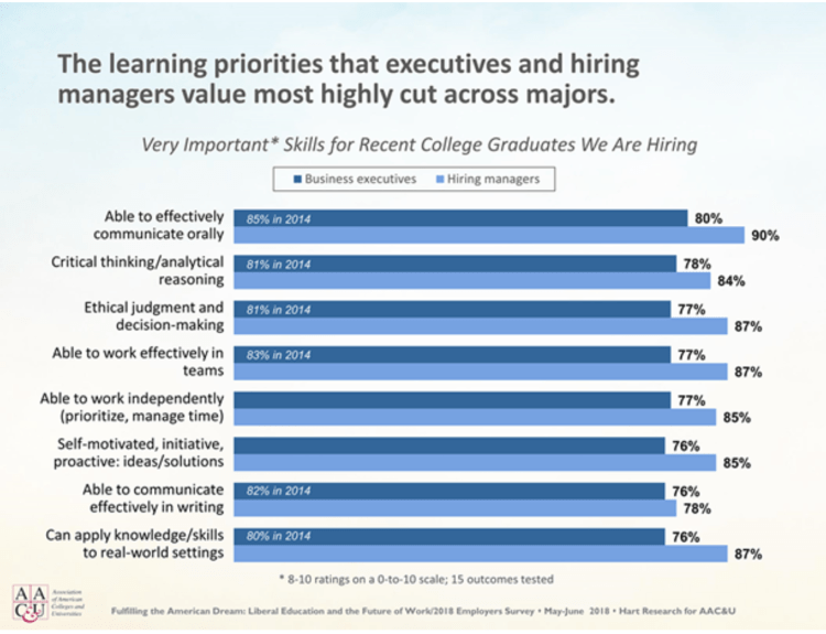 When hiring, executives and hiring managers place a high priority on graduates’ demonstrated proficiency in skills and knowledge that cut across majors, and hiring managers are closely aligned with executives in the importance that they place on key college learning outcomes.