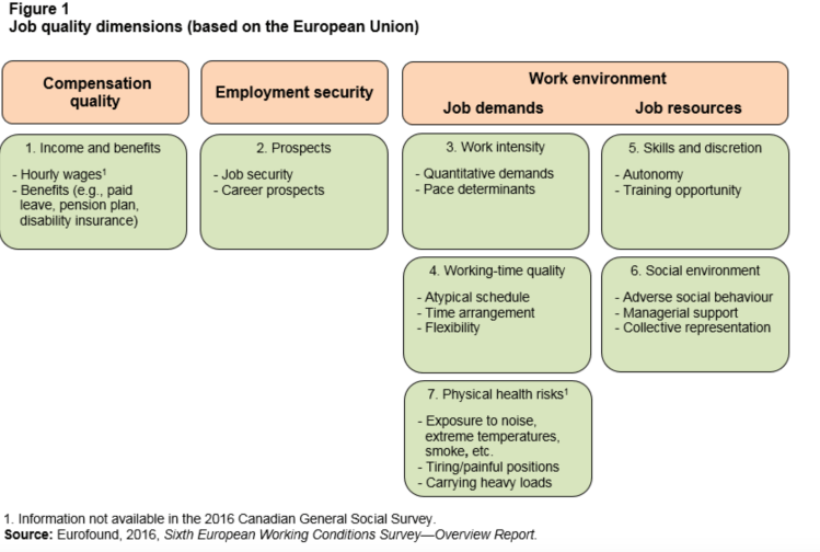 This study assesses job quality in Canada using an internationally inspired multidimensional framework that covers six broad aspects: income and benefits, career prospects, work intensity, working-time quality, skills and discretion, and social environment. The analysis uses the 2016 General Social Survey, which collected a rich set of information on working conditions in Canada.
