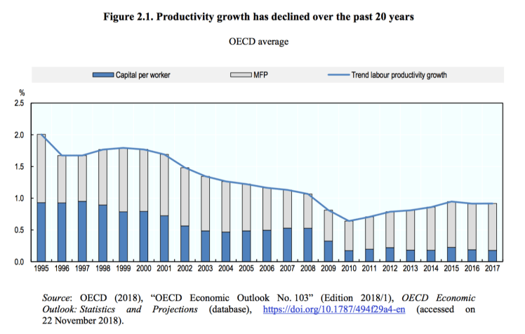 In most countries productivity gains from technological change and globalisation have not been broadly shared with workers. Productivity growth at the technological frontier remains high, suggesting that only a small group of innovative firms are able to fully take advantage of technological advances and globalisation, while many others trail further and further behind, weighing on aggregate productivity growth. At the same time, the distribution of income has become more tilted towards capital at the expense of labour income and the distribution of income and wealth has become increasingly unequal. Higher employment rates have mitigated but not prevented the rise in income inequality, and more remains to be done to better integrate those excluded from the labour market and to raise the effectiveness of redistribution through the tax and benefits system.