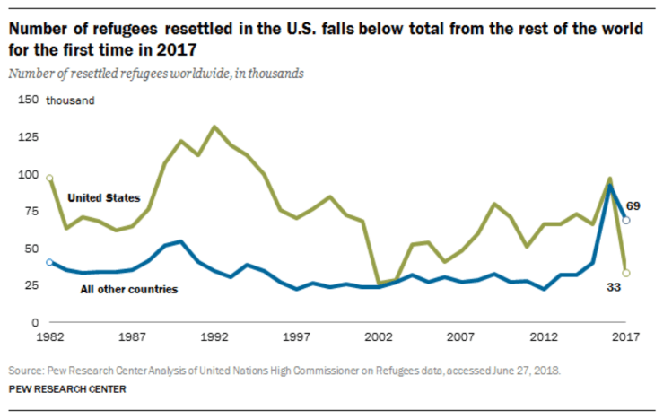 The number of refugees resettled in the U.S. decreased more than in any other country in 2017. That year the U.S. resettled 33,000 refugees, the lowest total since the two years after the terrorist attacks of Sept. 11, 2001, and a steep drop from 2016. Non-U.S. countries resettled more than twice as many refugees as the U.S. in 2017, marking the first time since the adoption of the 1980 U.S. Refugee Act that America’s total fell below the combined total from the rest of the world.
