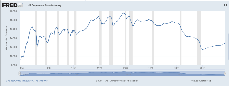 The big picture: There were 12.8 million manufacturing jobs as of October, up from the 11.4 million in March 2010, the nadir of the financial crash, according to the St. Louis Fed. But they are still a shadow of their modern 19.4 million-job peak in 1979, and right about where they were in October 1941, when the U.S. population was 133 million, 40% of today’s.