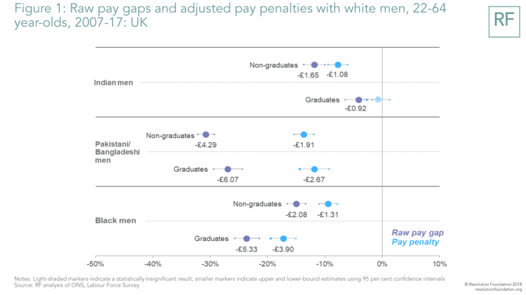Getting a handle on the size, causes of, and responses to ethnicity pay inequalities is of critical importance. A proportion of the hourly ‘pay gaps’ experienced in recent years can be explained by differences in personal and work-related characteristics that exist between groups, such as region, education to occupation, industry and contract type. However, the report found that even after such factors are taken into account, large ‘pay penalties’ persist. For instance, the 31 per cent pay gap experienced by non-graduate Pakistani and Bangladeshi men halved to a pay penalty of 14 per cent, (-£1.91 per hour) once background factors were accounted for.1 That’s still a huge pay penalty. It was bigger still for black graduate men, who faced the biggest pay penalty of 17 per cent (-£3.90) after adjustments.