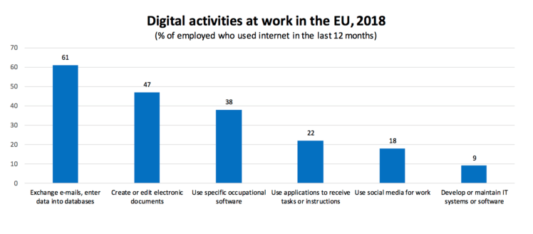 The most common work activities with computers, laptops, smartphones, tablets or other portable devices or computerised equipment in the EU were exchanging emails or entering data in databases (61%), creating or editing electronic documents (47%) and using specific occupational software (38%). Applications to receive tasks or instructions were used by 22% of employed internet users and social media were used for work by 18%. 9% of employed internet users were involved in developing or maintaining IT systems or software.