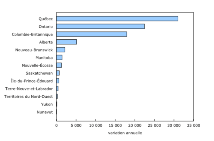Au Québec, il y avait 31 000 (+35,5 %) postes vacants de plus par rapport au même trimestre un an plus tôt. * La hausse dans la province était généralisée dans la plupart des secteurs, et près de la moitié de la hausse s’est concentrée dans les secteurs des soins de santé et de l’assistance sociale; des services d’hébergement et de restauration; et de la fabrication. En comparaison, ces secteurs représentaient environ un tiers de l’emploi, selon l’Enquête sur les postes vacants et les salaires.