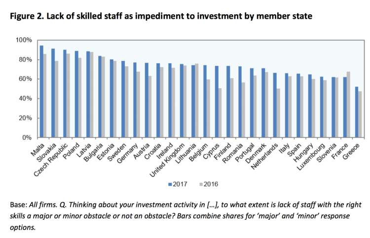 Indications of skill gaps and mismatches in Europe are considerable though. For example, the OECD’s assessment of adult skills indicates that about a fifth of Europeans adults struggle with basic literacy and numeracy skills. Many Europeans work in jobs that do not match their talents. At the same time, employer frequently report that firms face difficulties to find people with the right skills. Recent results from the EIB Investment survey suggest that the limited availability of people with the right skills is increasingly viewed as an obstacle: More than seven in ten European firms see it as an impediment to investment. This concern is broadly shared across the EU, among firms of different size and operating in different sectors. Notably, limited availability of skills is seen as a problem by firms in Central Eastern and South-eastern Europe where economies try to catch up with the technology frontier, but is also felt increasingly as a problem in countries close to potential and recovering from the crisis.
