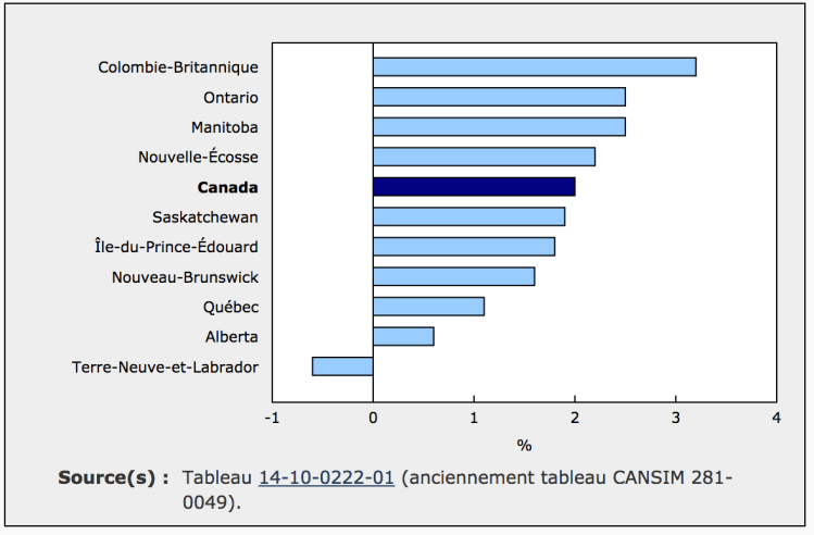 Graphique : Variation sur 12 mois de la rémunération hebdomadaire moyenne par province, novembre 2018