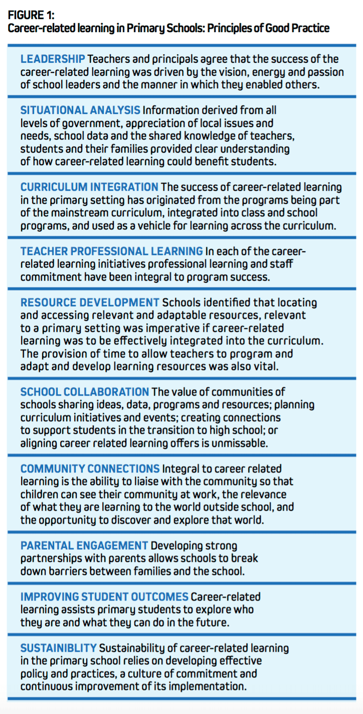 In this report we use the term ‘career-related learning’ (CRL) to encompass early childhood activities in primary schools designed to give children from an early age a wide range of experiences of and exposure to education, transitions and the world of work. This is part of a lifelong learning and career development process.