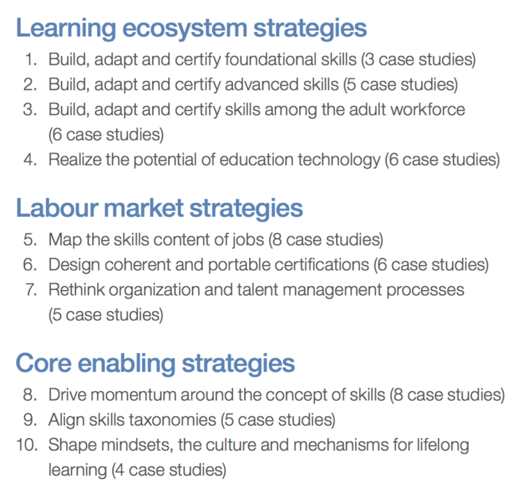 In this white paper we suggest ten strategies to make this vision a reality, spanning across three types of interventions. The first type aims to integrate a skills focus in the learning ecosystem; the second aims to integrate a skills focus in the workforce ecosystem; and the third type aims to provide an enabling environment through alignment between different stakeholder groups.