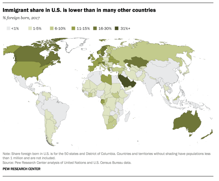 Chosen excerpts by Job Market Monitor. Read the whole story at Immigrant share in U.S. nears record high but remains below that of many other countries | Pew Research Center