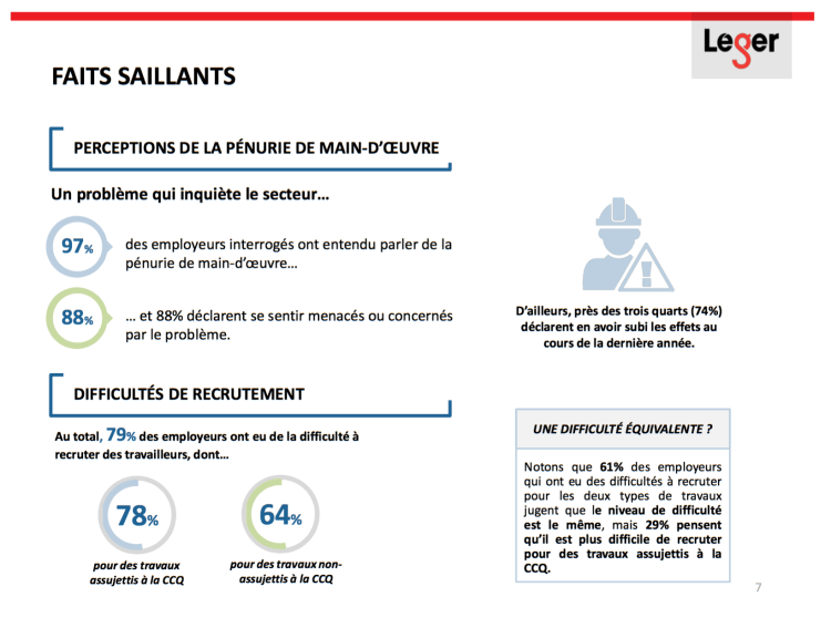 « Les résultats sont éloquents : la pénurie de main-d’œuvre freine la croissance économique de l’industrie de la construction et la productivité de ses entreprises. Le secteur de la construction et de la rénovation résidentielles représente un important catalyseur économique pour toutes nos régions qu’il serait risqué d’affaiblir », souligne monsieur Vincent.