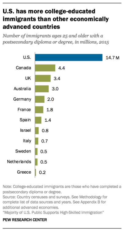 The United States is home to more college-educated immigrants than any other country. As of 2015, there were 14.7 million immigrants ages 25 and older with a postsecondary diploma or college degree living in the U.S. – more than triple the number in Canada (4.4 million) and more than four times as many as in the United Kingdom (3.4 million), according to a recent Pew Research Center report.