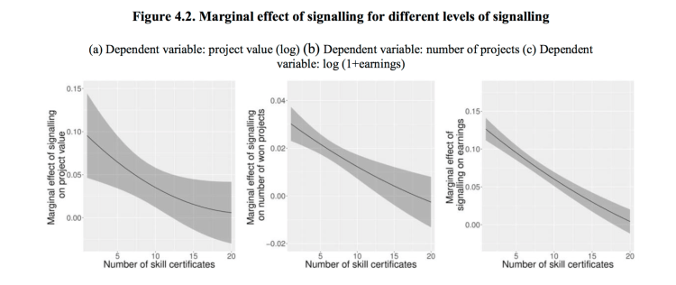This paper studies the effects of a voluntary skill certification scheme in an online freelancing labour market. The paper show that obtaining skill certificates increases a worker’s earnings. This effect is not driven by increased worker productivity but by decreased employer uncertainty. The increase in worker earnings is mostly realised through an increase in the value of the projects obtained (up to 10%) rather than an increase in the number of projects obtained (up to 0.03 projects). In addition, the paper finds evidence for negative selection to completing skill certificates, which suggests that the workers who complete more skill certificates are, on average, in a more disadvantaged position in the labour market. Finally, skill certificates are found to be an imperfect substitute to other types of standardised information. On the whole, the results suggest that certificates play a role in helping new workers break into the labour market, but are more valuable to workers with at least some work experience. More stringent skill certification tests could improve the benefits to new workers.