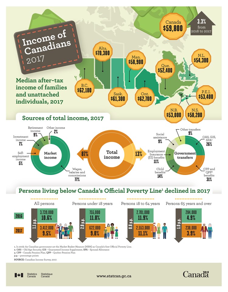 Median after-tax income of Canadian families and unattached individuals rose 3.3% to $59,800 in 2017, following two years without growth. This gain was the result of a combination of factors, including higher wages and salaries among non-senior families (where the highest income earner was less than 65 years of age), and an increase in child benefits. In 2018, the Canadian government set the Market Basket Measure (MBM) as Canada’s first Official Poverty Line. The share of the population living below Canada’s Official Poverty Line, fell from 10.6% in 2016 to 9.5% in 2017.