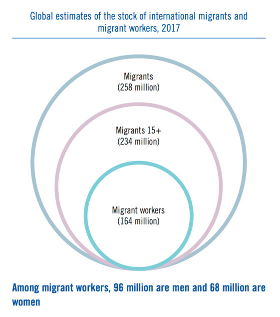 Based on figures for 2017 provided by the United Nations/ Department of Economic and Social Affairs (UN/DESA), which are adjusted for the number of refugees, there are 258 million international migrants, 234 million migrants of working age (15 and older)1 and 164 million migrant workers worldwide. For the purposes of this report, the term “international migrants” refers to persons who are foreign-born (or foreign citizens when place-of-birth information is not available), while the term “migrants of working age (15 years of age and over)” is a subset of international migrants. The term ‘“migrant worker”, on the other hand, refers to international migrant individuals of working age and older who are either employed or unemployed in their current country of residence. Overall, migrants of working age constitute 4.2 per cent of the global population aged 15 and older, while migrant workers constitute 4.7 per cent of all workers. In destination countries, the higher share of migrant workers among the global workforce than among the global population of working age is due to the higher labour force participation rate of migrants (70.0 per cent) compared to non-migrants (61.6 per cent).