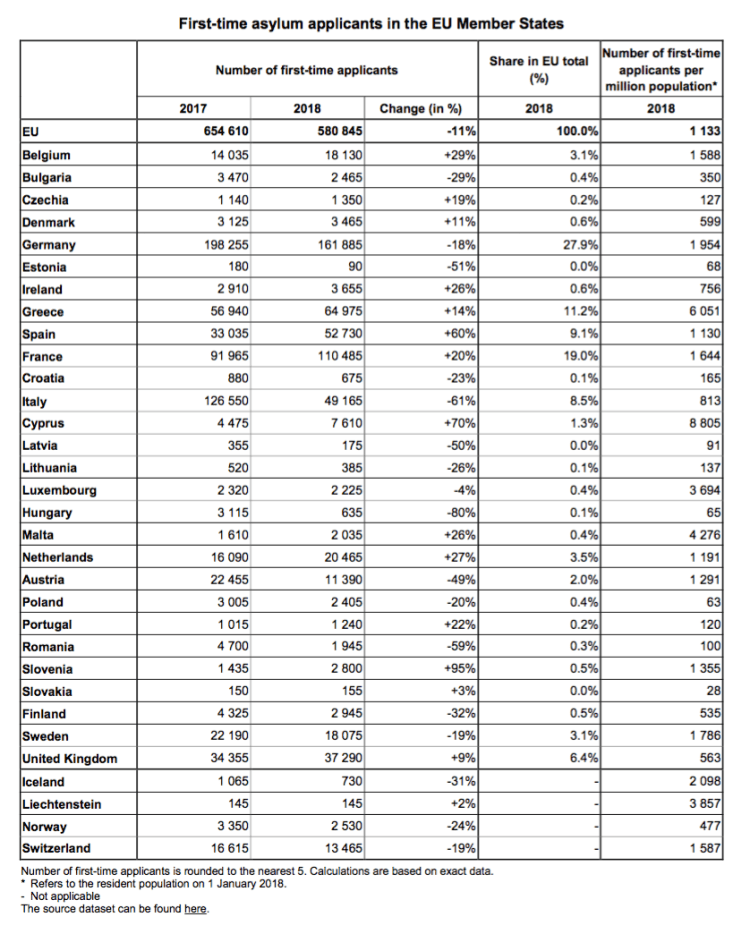 Chosen excerpts by Job Market Monitor. Read the whole story at 580 800 first-time asylum seekers registered in 2018, down by 11% compared with 2017