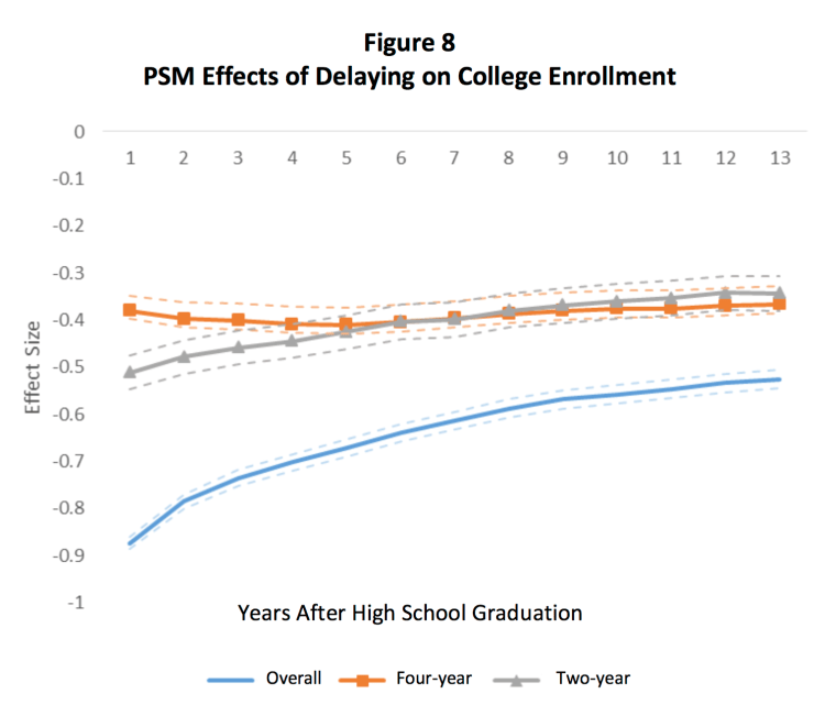 The results show that delaying college enrollment decreases individuals’ likelihood of enrolling in college and increases their tendency to enroll in two-year colleges if they do return to school. Delayers experience early earnings benefits, but these fade out after their mid-20s and turn to significant losses over time. Differences in student characteristics only explain one third of the pay gap between delayers and on-time enrollees; 60 percent of the pay gap is explained by delayers’ reduced likelihood of attending and obtaining a degree at a four-year college.