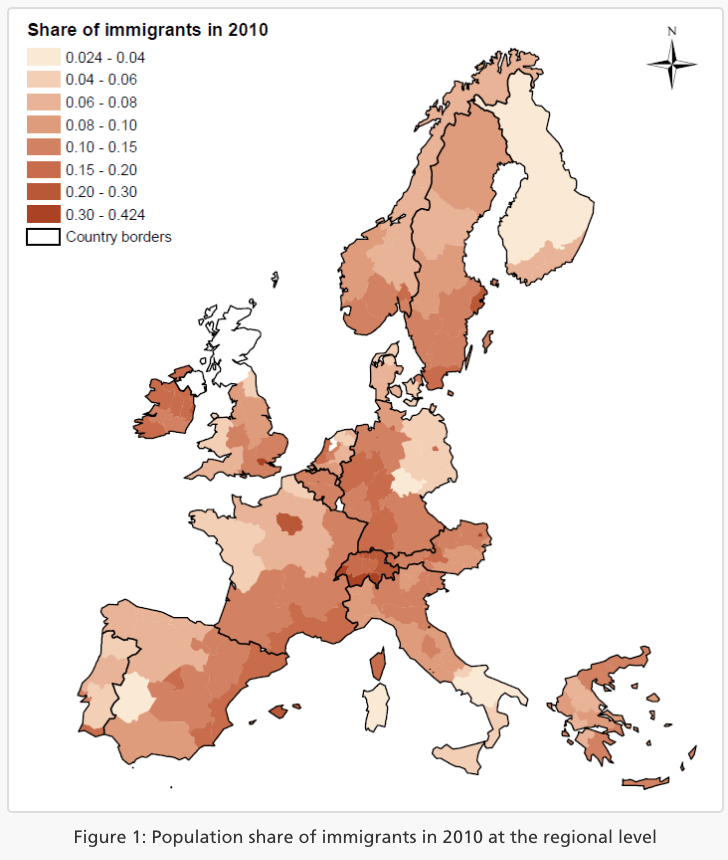 The authors used population census and register data at the regional level for 140 regions in 16 different European countries to paint a picture on immigrant populations across Europe. The share of immigrants varies strongly between these regions as indicated in Figure 1.