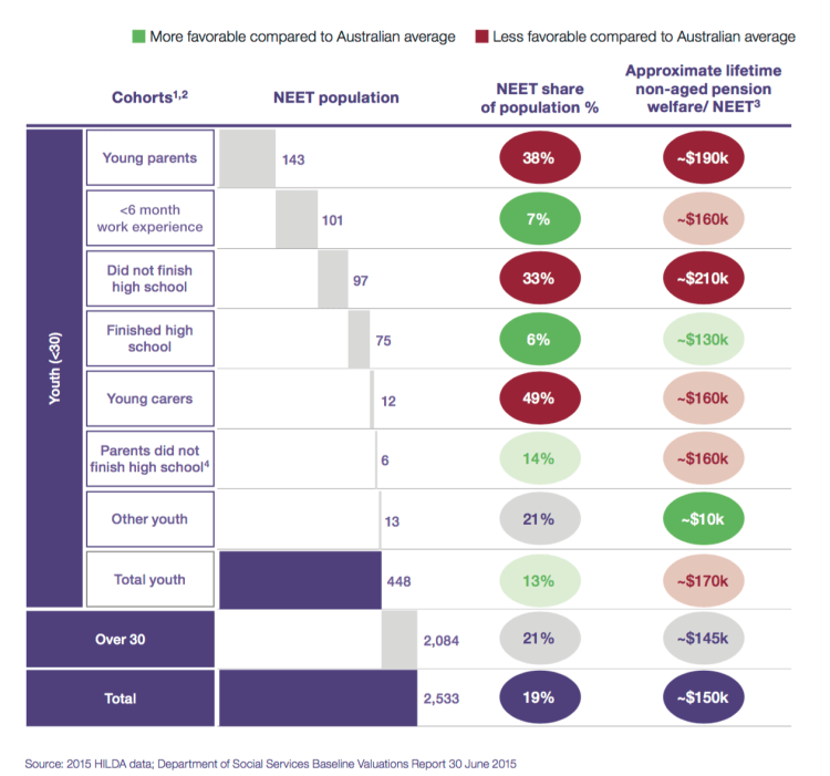 Among youth, young parents, carers, and those who did not finish high school are more likely to be NEET and have higher average welfare costs, meaning initiatives that focus on these segments could have outsized benefits.