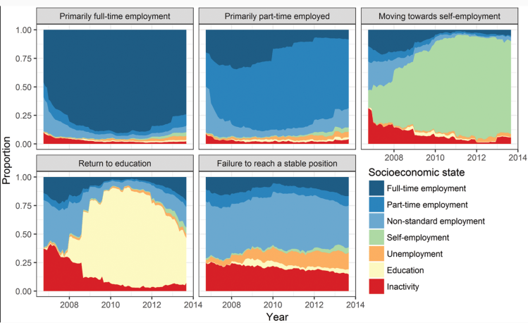 This research has shown that taking a longitudinal perspective on school-to-work transitions more realistically fits current labour market experiences of entrants than other approaches, and is also able to test hypotheses that often remain implicit assumptions. More importantly, using SA has allowed us to look beyond single points in time. The literature often reports positive effects of vocational education in one’s early career, and our results indicate that these effects may be the consequence of smoother transitions, rather than reflecting human capital differences between vocationally and generally educated school-leavers. If we had applied a transversal design with our sample, we could have, depending on which vocational field, type of instruction, or number of post-education years we had focussed upon, found positive, negative, or no vocational effects on employment and wages. However, due to using SA and its focus on trajectories, we were able to show clear distinctions in the school-to-work transitions of generally and vocationally educated school-leavers. A smooth transition into working life is in itself valuable and can have a lasting effect on careers. If, as our results seem to indicate, vocational education facilitates the transition but does not lead to substantial advantages in terms of (remunerable) skills, the challenge for policymakers lies in increasing the latter without losing the benefits of the former.