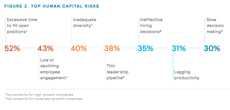 Amid the prediction of disruption lies confidence: Four out of five executives believe their company can lead disruption in their industry, and nearly all are taking action to prepare for the future of work. As organizations ready themselves, there are significant human capital risks — from the inability to close the skills gap to low engagement — that can slow the progress of transformation (Figure 2).