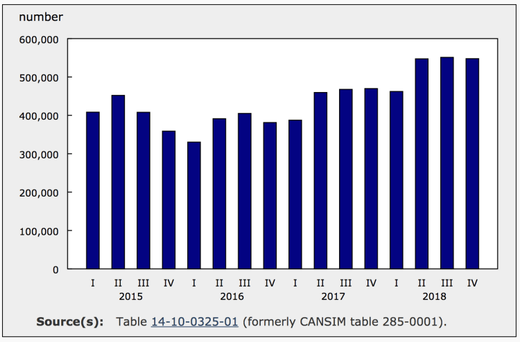 The number of job vacancies in Canada (unadjusted for seasonality) was little changed from the third quarter to the fourth quarter of 2018. Similarly, vacancies were also little changed from the third quarter to the fourth quarter of 2017, while they declined from the third quarter to the fourth quarter of 2016.