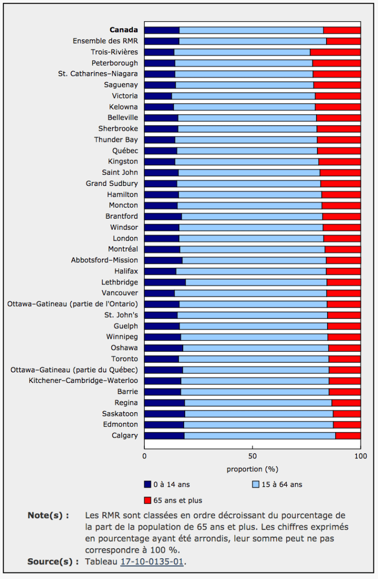 Malgré ces tendances, certaines RMR du pays présentent des populations plus âgées que plusieurs régions situées à l’extérieur des RMR, dont Trois-Rivières (23,2 %), Peterborough (22,2 %) et St. Catharines–Niagara (22,1 %). La RMR de Calgary continue de présenter la plus faible proportion de personnes âgées de 65 ans et plus (11,6 %).