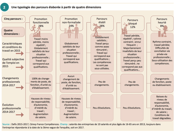 Cette vue d’ensemble est à nuancer car les évolutions professionnelles perçues par les salariés sont très dif- férentes selon le contexte dans lequel ils évoluent, ou selon leur position dans l’entreprise. Une typologie construite à partir d’une analyse statistique permet de rendre compte de cette diversité.