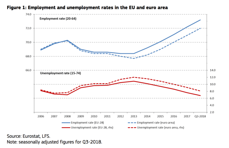 Unemployment has returned to its pre-crisis level, but remains high in a number of Member States. Thanks to the steady labour market recovery, the unemployment rate kept declining in 2017, to reach 6.8% in the third quarter of 2018. It now stands at the lowest level in ten years, more than 4 percentage points (pps) below the 2013 peak. In the euro area, the unemployment rate at 8.1% in Q2-2018 remains almost one percentage point higher than the lowest level registered in 2008. Unemployment rates are still particularly high in certain Member States.